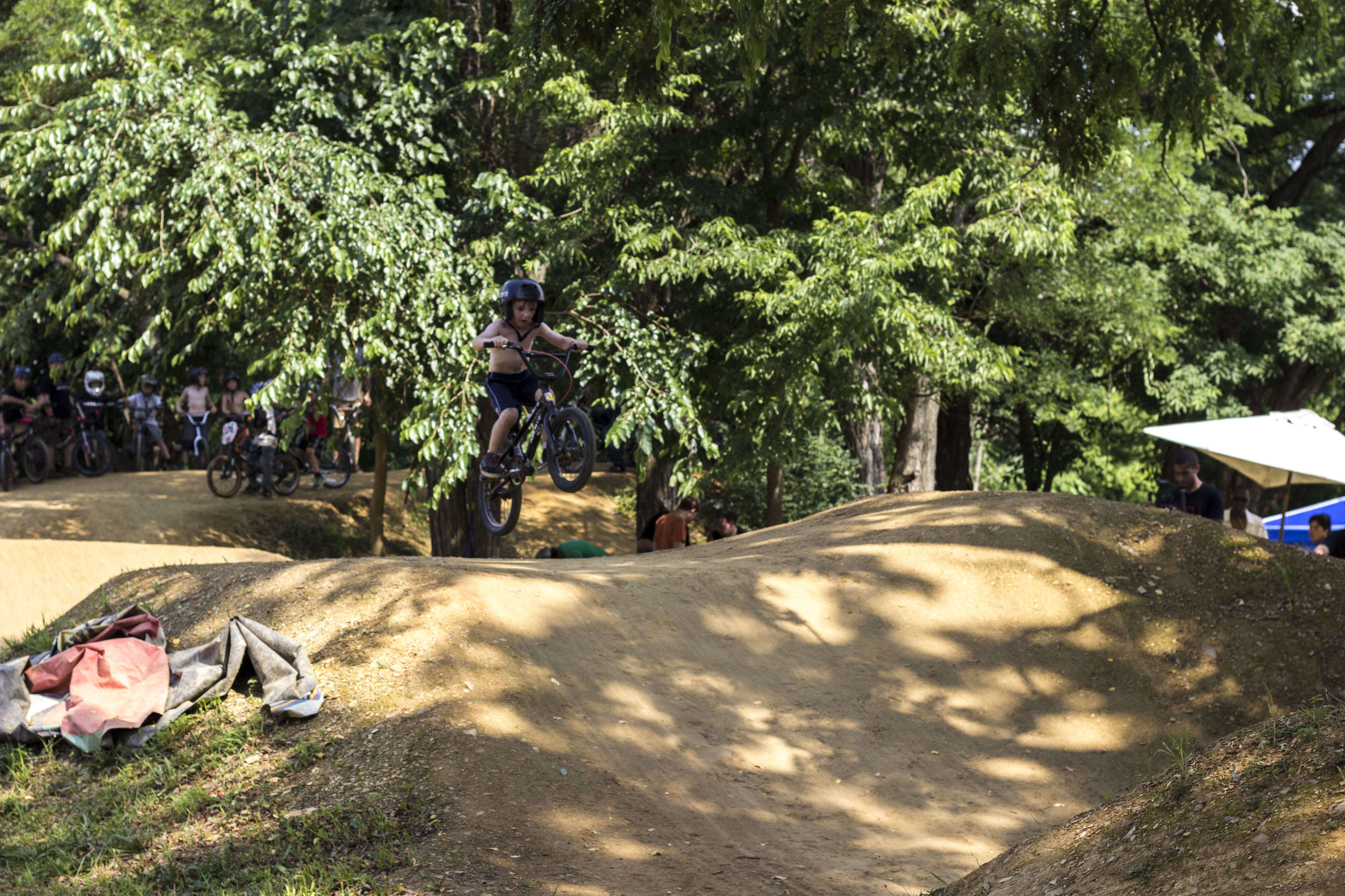 After the rain passed the dirt jumps were untarped and ready for action. Beginner dirt had riders ages 5 through 12 throwing down on the Dirtsculpt-designed mini pump track. 10 year old Rider Delfino took 1st place by riding like the big guys, linking flowing airs though the rhythm and carving berms at speed. 2nd place went to 12 year old Sawyer Sorrells who served double duty helping TRA set up for the contest along with contest co-organizer and mom, Diane Sorrells. 3rd place went to 12 year old Nick Suhr who laid down some great runs to round out the podium. One of the highlights of the class was 5 year old Garrett Hawkins who rebel-ran the entire course backward every time.