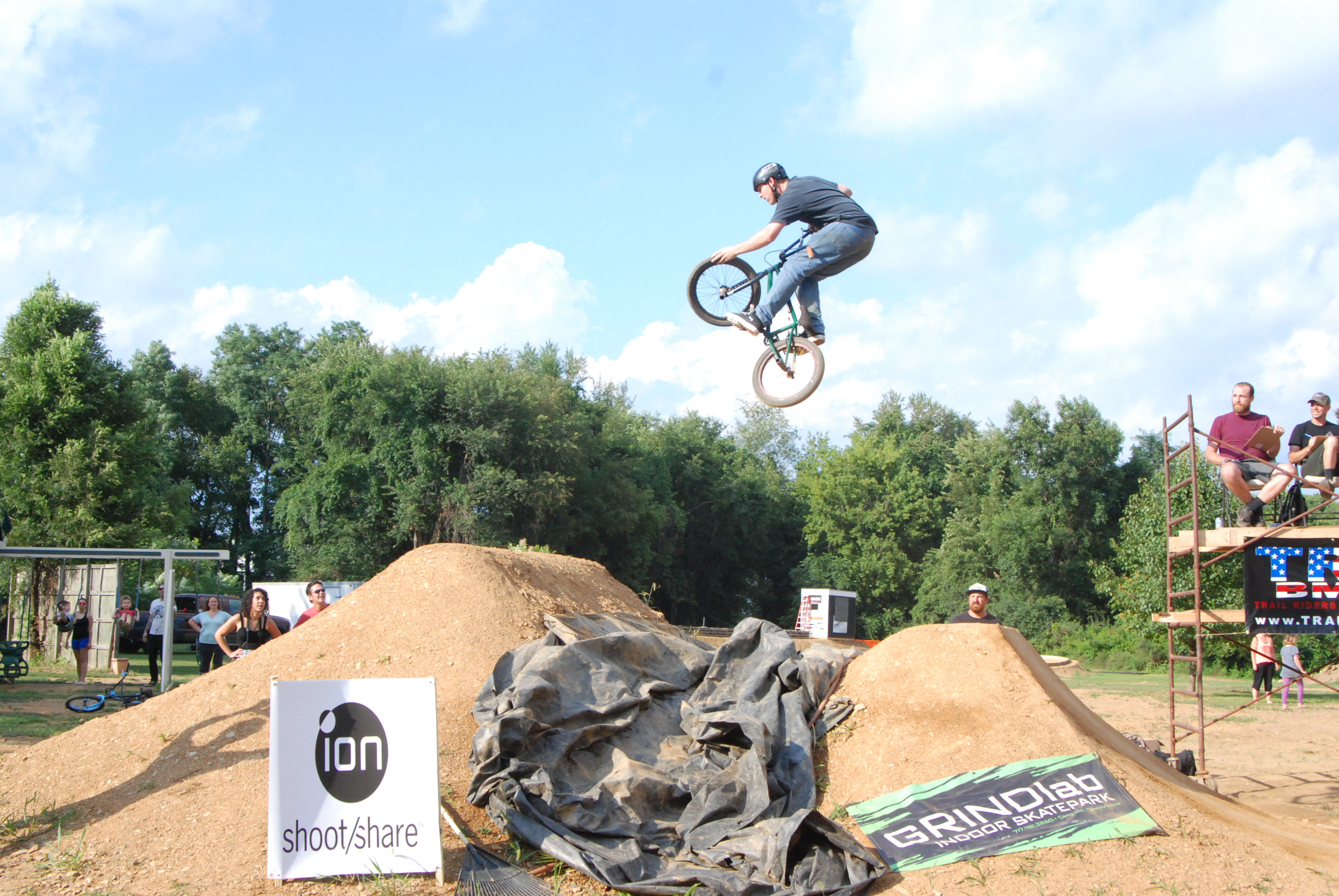 There were four contests: Beginner Park, Expert Park, Beginner Dirt, and Expert Dirt. The panel of judges included Catty Trails’ / Axelrad’s Matt Trieval, Catty’s Kyle “Abe” Abraham, and Posh trails’ main caretaker and Red Bull Stomping Grounds / Dreamline contest judge, Jay “J Bone” Lonergan. Each rider got 3 runs and highest average score was used to determine the top three in each class. Mike Gentilcore announced the action with 70’s and 80’s metal blasting over the PA while Jami Braafheart, Grindlab owner and all-around good soul, served up the grill and kept everyone full of tasty goodness. iON was on site to demo their HD Sports camera line and iON’s Alaine Gordon presented a brand new HD camera to first place Expert Dirt. TRA VP, Dave King added that “My iON camera works awesome and gives a clearer picture than other cameras I’ve tried. I’ve used mine at Catty for a while now and it rules. We’re psyched to have one as a prize for this contest.”
